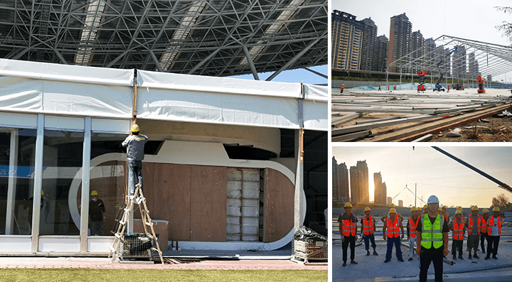 靈通大型展覽篷房可滿足于各種不同的活動需要。跨度:10m-40m,模塊化結構,搭建工期短,易于組裝和拆卸。可選用全系列的配件,篷布張緊系統。從啤酒篷房至貿易展銷會和展覽用篷房再到體育綜合設施,設計的應用領域非常廣泛。在配套設施方面,您可選擇PVC篷布、地板、玻璃墻組件、模塊式墻面和實木門等。如有需要,可配備大量綜合性配件,包括完整的裝飾、照明和空調系統,透明頂篷、山墻等個性化配套設施。大型展覽篷房和裝配式篷房外形優雅、搭建靈活、安全環保、防雨、防曬、 防霉、阻燃,可抗8-10級大風,它適用于各類戶外臨時性活動。